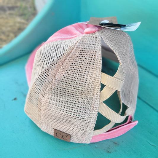 Washed Denim Criss Cross High Pony CC Ball Cap - Coral/Beige