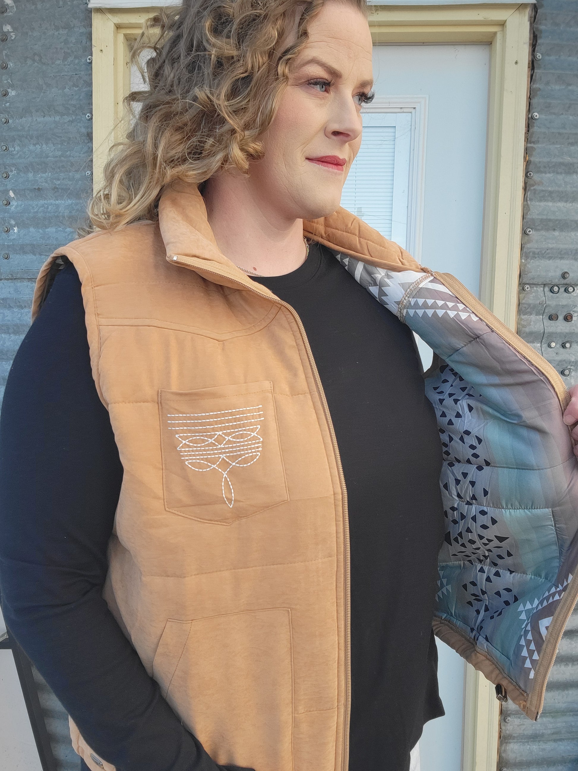 Find comfort and style this year with this fun and adorable Camel Puffer Vest! With the boot stitch detailing, suede look, and the Aztec lining, this vest is so unique! Quilted padding, spacious hand pockets, a high collar, and front zip closure... this vest is the perfect package for warm and cozy! Wear with your favorite long sleeve and jeans. And you can't go wrong with a pair of boots and cowboy hat.