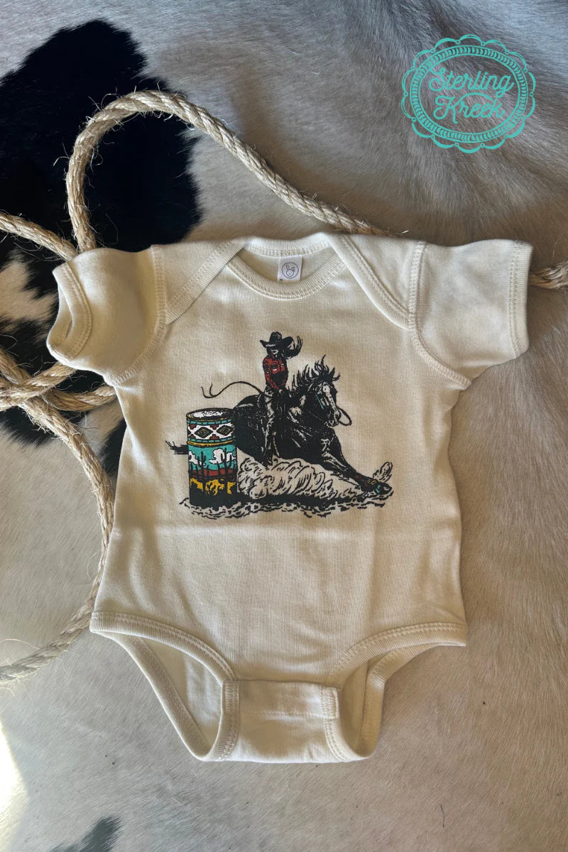 A barrel racing t-shirt for the littlest cowgirl! This tan tee-shirt is perfect for the mini horse-loving, thrill-seeker.