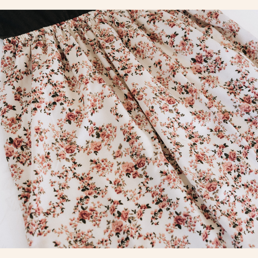 The Olive Green Floral Dress features a stunning floral chiffon skirt, stretchy waist, and a t-shirt inspired top with a scoop neckline.
