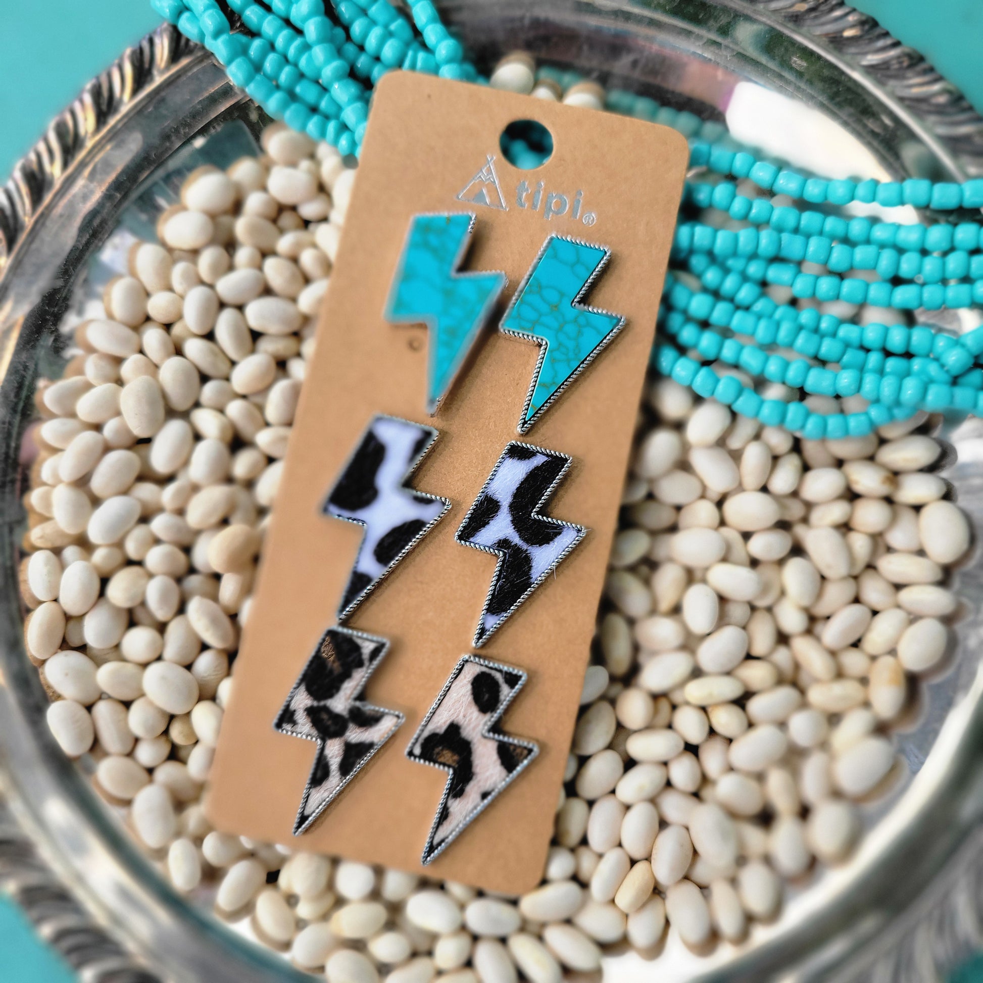 A thunderbolt earring to go with every outfit! This set features Turquoise, Cow print, and Leopard Print. So fun!
