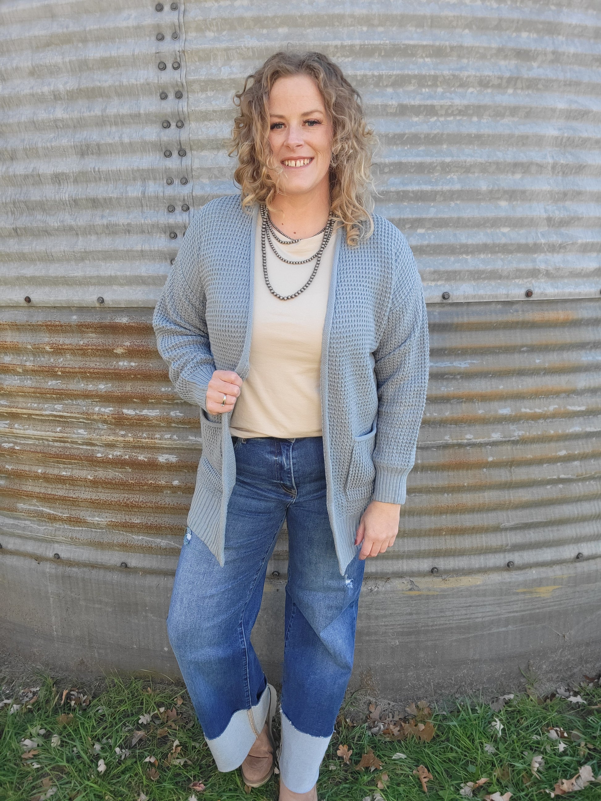 This cardigan is a cozy midweight waffle knit! It has two front pockets.