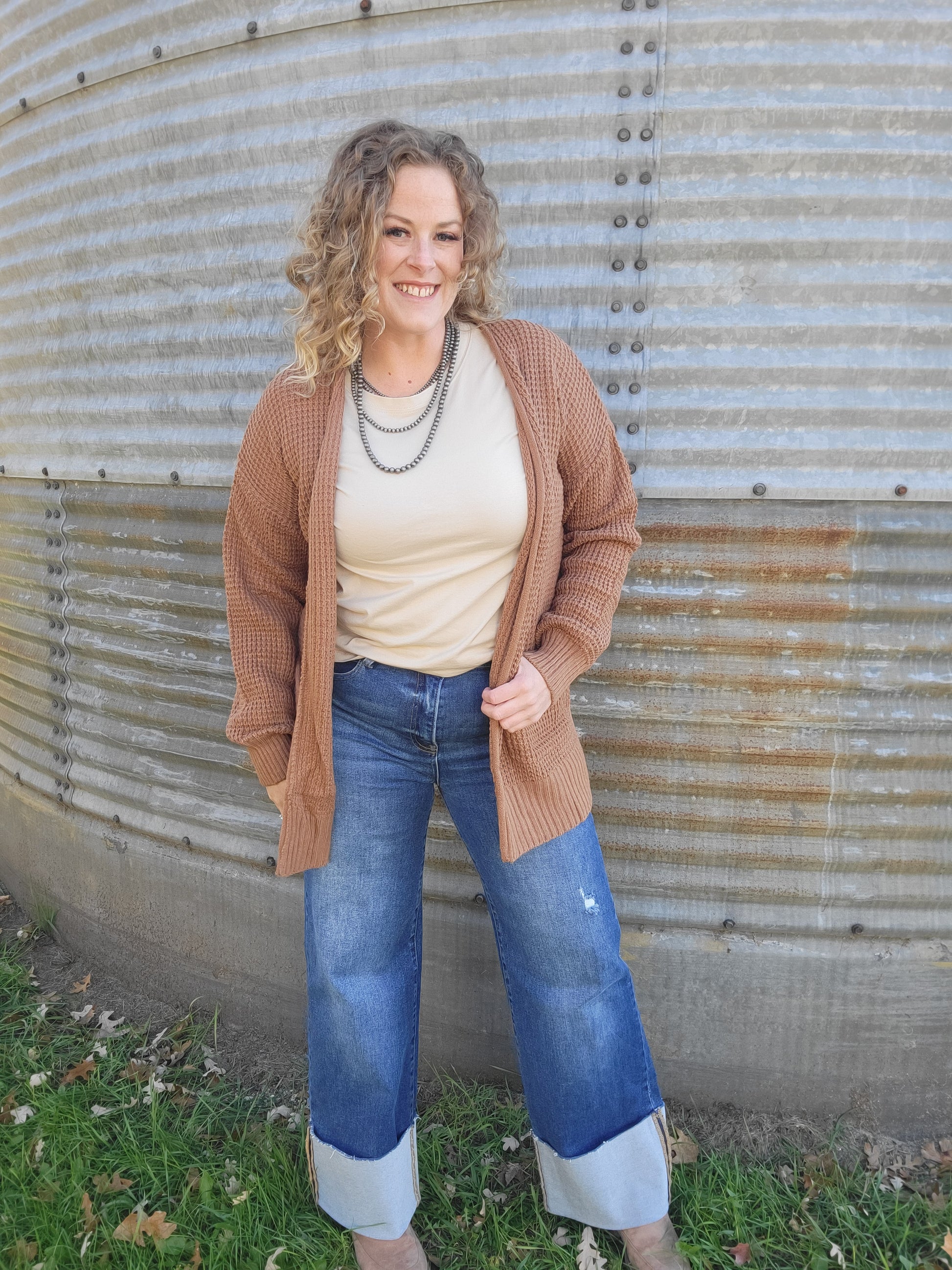 This cardigan is a cozy midweight waffle knit! It has two front pockets.